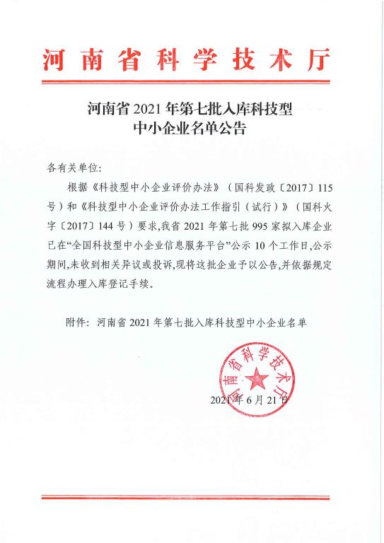 根据《科技型中小企业评价办法》(国科发政〔2017〕115号)和《科技型中小企业评价办法工作指引(试行)》(国科火字〔2017〕144号)要求,河南省科学技术厅下发的《河南省2021年第七批入库科技型中小企业名单公告》,科技型中小企业门槛较高,入库须经过严格的测评和审批程序,河南深蓝静行光电科技有限公司凭借过硬的科技实力入库“国家科技型中小企业”并获得荣誉称号,编号为:2021410311A0009542。